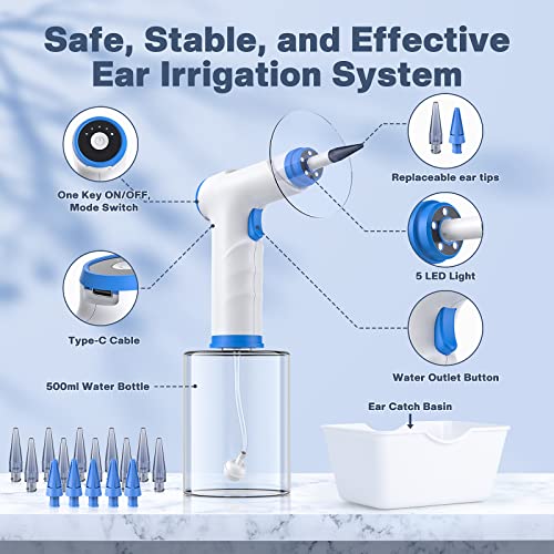 Ear Wax Removal, Electric Ear Cleaning Kit with Light, Ear Irrigation Kit with 4 Pressure Modes, Safe and Effective Ear Flush Kit with Ear Cleaner – Includes Basin, Towel & 15 Tips