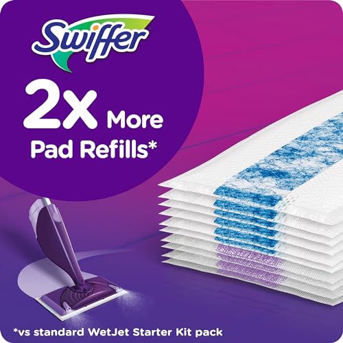 Swiffer WetJet Hardwood and Floor Spray Mop, All-In-One Mopping Cleaner Starter Kit, Includes: 1 WetJet, 10 Pads, Cleaning Solution & Batteries 16 Piece Set, Purple