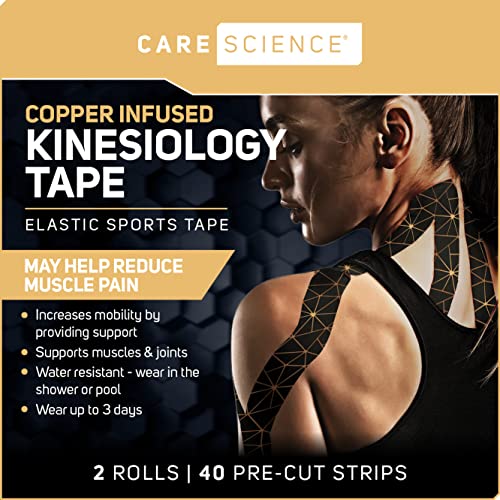 Care Science Waterproof Kinesiology Tape, 40 ct Precut Strips (2 Rolls), Copper Infused | Water Resistant Strips, Elastic Athletic Tape for Sports & Weightlifting, Muscle Strain Relief & Joint Support