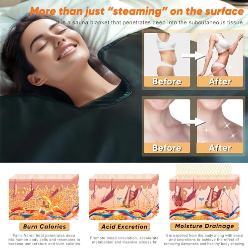 Widely applicable: The size of the sauna blanket is 70.9*31.5IN. The oversized design can meet the needs of people of most body types, allowing you to avoid the cost of going to the sauna room and enjoy the comfort and efficacy of the sauna at home.