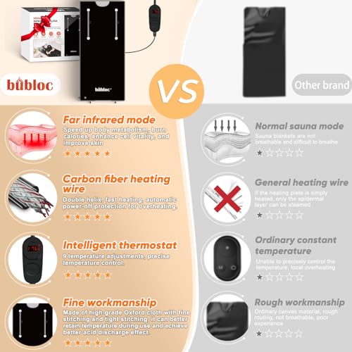 Upgraded Portable Far Infrared Sauna: Far infrared mode can penetrate deep into your skin while sauna, promote blood circulation and metabolism, and discharge secretions and toxins deep in the skin. The personal sauna blanket uses double helix carbon fiber heating wire, which heats up faster. It automatically cuts off the power to stop heating at high temperatures to prevent burns.